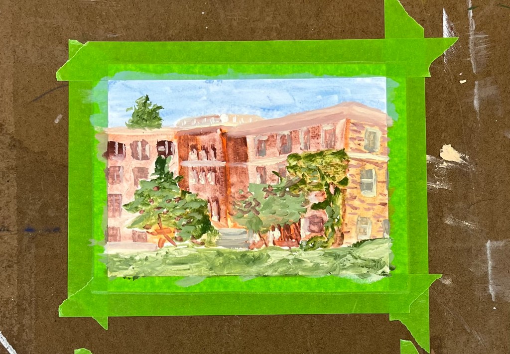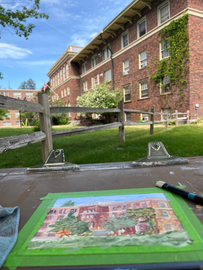 Our last week was one I’d been looking forward to, because we were set to go outside for some plein air sessions. I’ve never done this before and was really looking forward to trying to capture how gorgeous campus is this time of year. Monday, we set out with our arms filled with our painting gear and wandered campus to find the perfect spots. Our assignment: one zoomed-out painting, one close-up, and another of our choice.